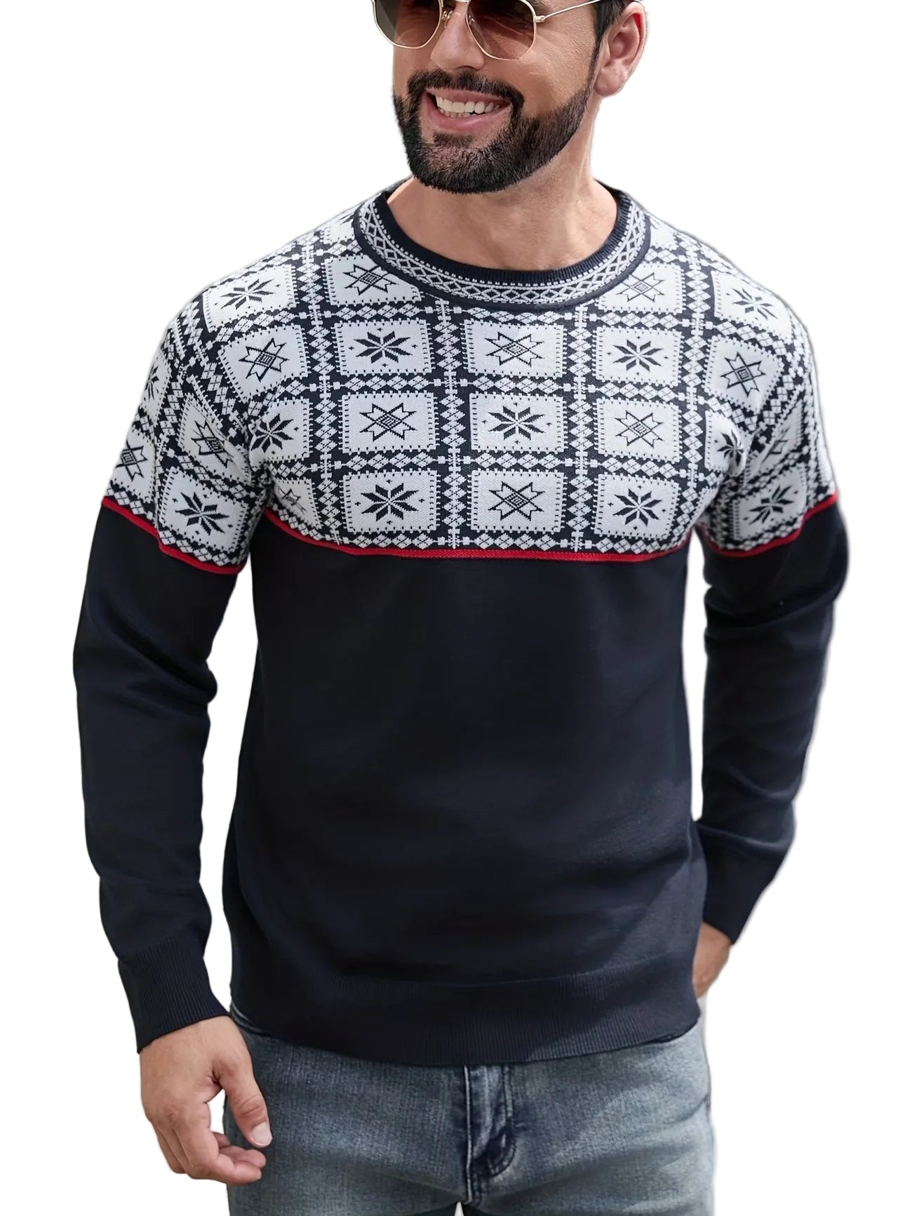 This men’s crewneck sweater features a two-part horizontal style. The upper section, covering the chest, shoulders, and upper arms, is decorated with a repeating geometric pattern. A thin, contrasting horizontal line separates the patterned upper portion from the lower section and wraps around the torso and sleeves. Ribbed texture is applied at the rounded neckline, the cuffs of the sleeves, and the bottom hem.